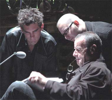 ... in Rollstühlen sitzend, durch gestapelte Holzpaneele erhoben in den Fluss, in das Ursymbol, den Rhein. Sie zitieren die Geschichte Deutschlands, von Blutvergießen und Tränen, durchmischt von Banalitäten, die das Leben doch auch ausmachen. Klagen an, dass die vergangen Zeiten nicht vergessen sein sollen, die doch jeder in sich trägt - mit sich rumschleppt. Das Bild des Flusses vermischt sich manchmal mit ihren Worten und ergänzt die Szenerie. Anstrengungen, den Text immer zu verstehen sind vergebens. Klangbilder eben...