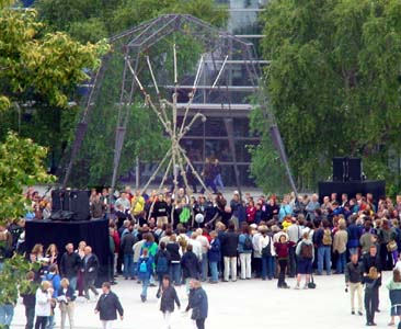 Auf der EXPO-Plaza geben Glöckner an einem stilisierten mobilen Glockenturm eine Kostprobe ihres Könnens: Tarzan würde blass, wenn er sie an ihren Glockensträngen in Formation schwingen sehen könnte. Dazu erklingt, von Glocken intoniert, zum Beispiel Chopins "Marche Funèbre! | |