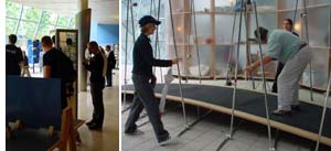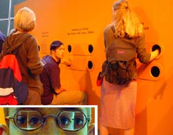 | ... werden die Installationen der Jenaer Gruppe "imaginata" in Foyer und Gärten des Deutschen Pavillons. "imaginata"-Mitglieder sind überall zur Stelle, um den Besuchern Fragen zu den Installationen zu beantworten, kleine Tricks aus dem Bauchladen zu demonstrieren oder auch solch wundersame Dinge wie ihre Prismabrille vorzuführen (s. Foto, kl. Bild). Alles natürlich zum Selbstausprobieren. |  Zum Hereingreifen: Die "Imaginata"-Installation im Nordgarten. Kleines Bild links unten: Exclusiv-Vorführung der Prismabrille durch den mobilen "imaginata"-Mitarbeiter © Foto: Cord Radke | |