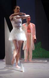 | Die Lübecker Gruppe "TanzOrtNord", die ihr Motto "7 Sinne, 7 Türme" auf der Bühne tänzerisch umsetzt. Die Bodenwannen der geometrischen Bühnenelemente sind mit Wasser gefüllt: Es wird in die tänzerische Performance miteinbezogen, während im Bühnenhintergrund großformatige Projektionen ablaufen. |  © Foto: Cord Radke | |