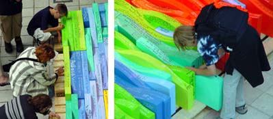 ... was die Gunst des Publikums angeht, hat Roswitha Steinkopf mit ihrer Installation "Greetings" (derzeit im Nordgarten des Deutschen Pavillons). Irgendwo schlummert wohl in jedem Menschen der Drang, sich für die Nachwelt zu verewigen. Die Installation, deren Elemente austauschbar sind, ist ein ganz simples Beispiel für interaktive Kunst; vielleicht funktioniert sie deshalb so gut?! | |