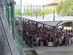 ... zeigt das nebenstehende Foto, sondern die Besucherschlange heute morgen, 10.45 Uhr, vor dem Eingang des Deutschen Pavillons. Aber lassen Sie sich dadurch nicht abschrecken: Falls es doch noch regnen sollte (was nicht unwahrscheinlich ist), haben Sie in der Warteschlange auf jeden Fall einen Platz im Trockenen - und die Möglichkeiten neuer Kontakte sind in solch einer Schlange besser als in jeder Disco... | |