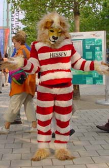 Ein "löwiges" Maskottchen tigert herum vor dem Foyer! Der Schriftzug auf seiner Brust lässt erkennen, es gehört zu Hessen. Außerdem ist Mr. Löwe plüsch-gepolstert, also gut präpariert für schwungvolle Umarmungen!