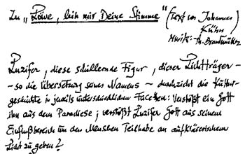 »Mein Luzifermonodram entdeckt die aufklärerischen Potentiale dieser Figur auch musikalisch: Synthesizer- und Akkordeonsound mit knallig-klaren Schlagzeugattaken, statt "Kirchenorgel" Toccaten, aphonisch-fragende Einzeltöne statt Choraldiktus, Revuesprache statt Predigtton-Gesang, Aufbegehren statt Ergebenheit sind die Chiffren (m)einer Musik, meiner "Lichtmusik", deren "Inhalte" heute aktueller denn je sein müssen...«